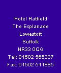 Lowestoft - resort town, fishing port and England's most easterly point. On the South side of Lowestoft is a modern resort with sandy beaches stretching from Corton in the north to the southern tip of Southwold. Here you will find the Hotel Hatfield, surrounded by spectacular sea views, and renowned amongst holidaymakers and conference organisers for its excellent facilities, high standards of service and cuisine.